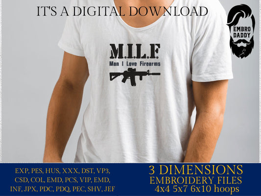 Machine Embroidery files, MILF, Man I Love Firearms, PES, dst, xxx, hus & more