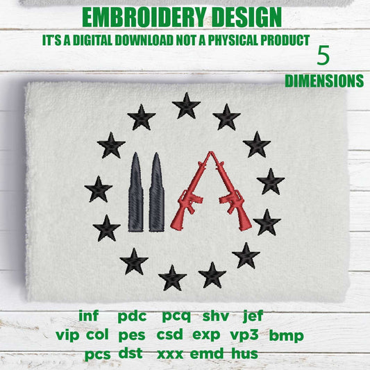 Machine Embroidery files, armed and dadly, USA flag guns, PES, dst, xxx, hus & more
