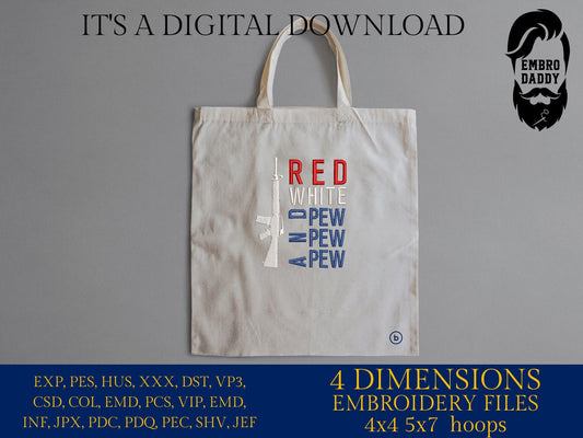 Machine Embroidery files, Red White and pew pew pew, DST, PES, xxx, hus & more
