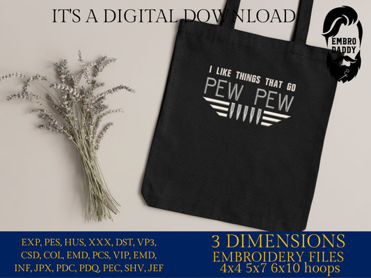 Machine Embroidery files, I like things that go pew pew , PES, xxx, hus & more