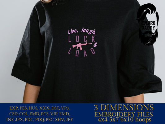 Machine Embroidery files, live, laugh, lock and load, PES, xxx, hus & more