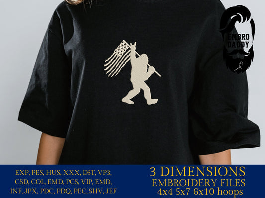 Machine Embroidery files, USA flag Bigfoot, Big Foot, Yeti, Sasquatch, PES, dst, xxx, hus & more