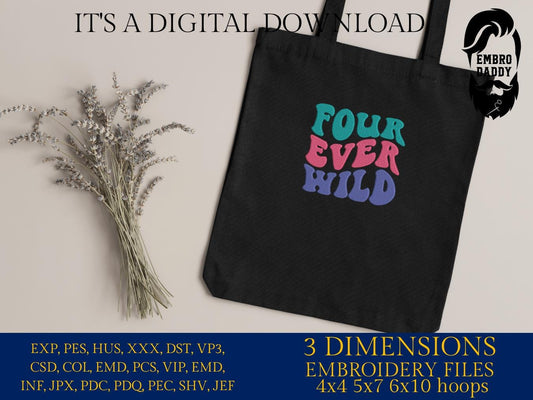 Machine Embroidery files, four ever wild, 4 years old, PES, DST, xxx, hus & more