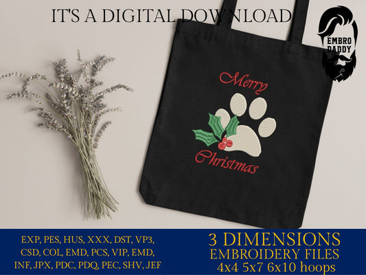 Machine Embroidery files, Merry Christmas Paw Print, PES, DST, xxx, hus and more