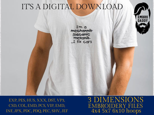 Machine Embroidery files, I'a a mechanic, fix cars, funny PES, DST, xxx, hus & more
