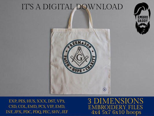 Machine Embroidery files, Freemason, faith, hope, charity PES, DST, xxx, hus & more