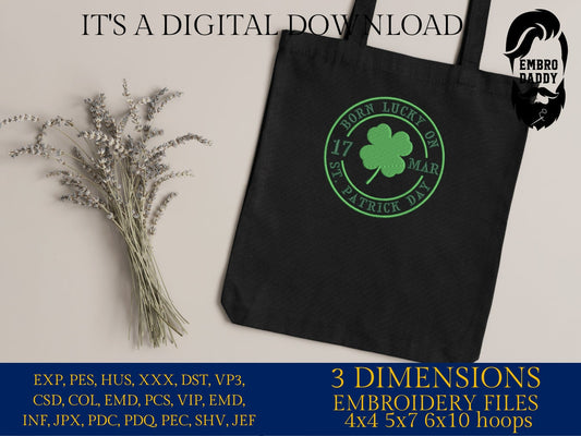 Machine Embroidery files, Born lucky on St. Patrick day, PES, DST, xxx, hus & more