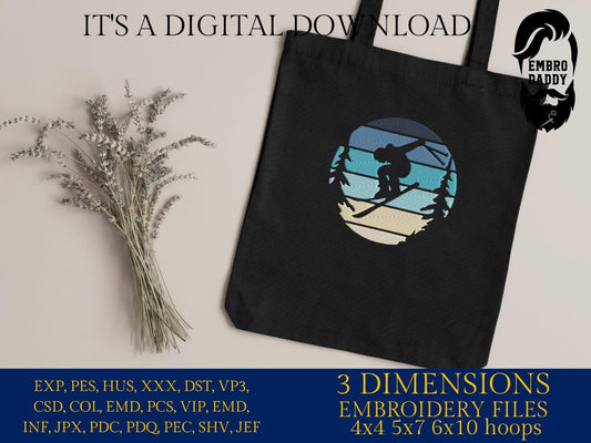 Machine Embroidery files, skier sunset, PES, DST, xxx, hus & more
