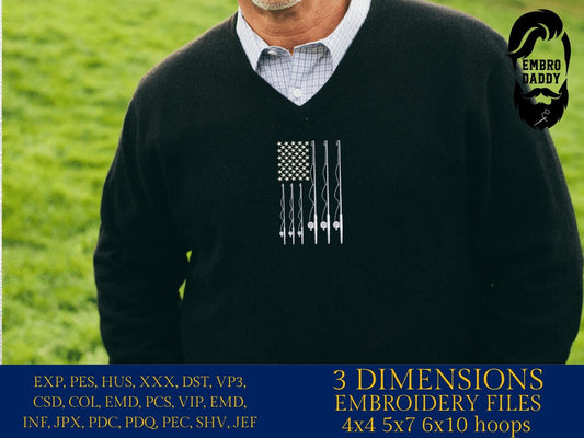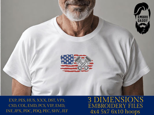 Machine Embroidery files, USA flag pistons, Mechanic, PES, DST, xxx, hus & more