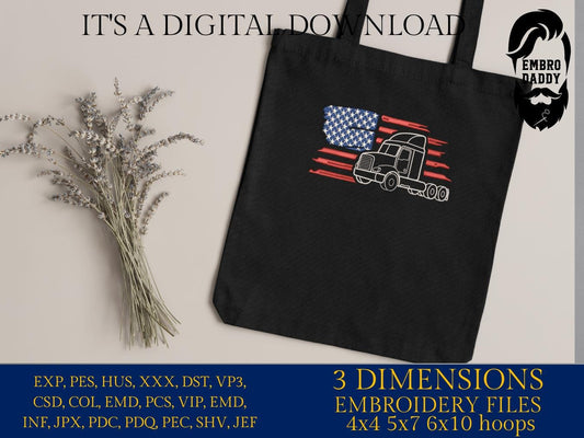 Machine Embroidery files, USA flag semi truck, PES, DST, xxx, hus & more
