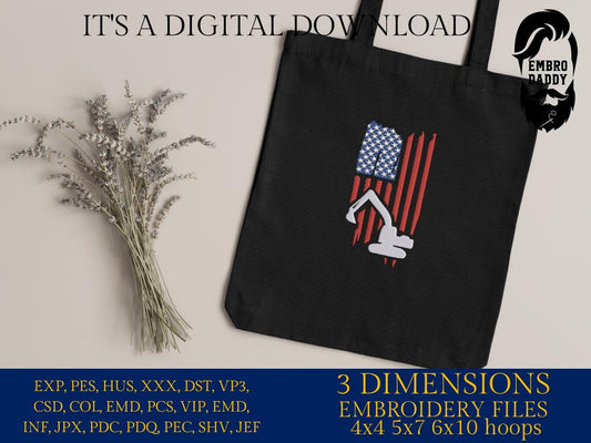 Machine Embroidery files, US flag Excavator, Heavy Equipment, Construction, PES, dst, xxx hus & more
