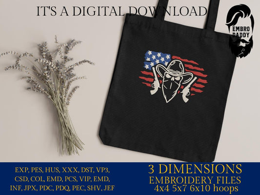 Machine Embroidery files, US Cowboy skeleton with gun, Usa Flag, PES, DST, xxx, hus & more