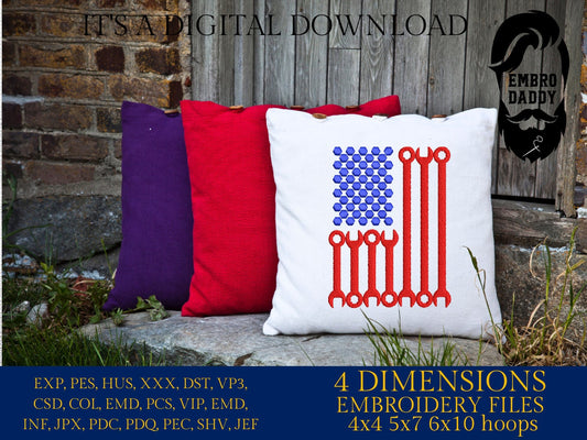 Machine Embroidery files, USA flag wrench bolts, PES, xxx, hus & more, embroidery files
