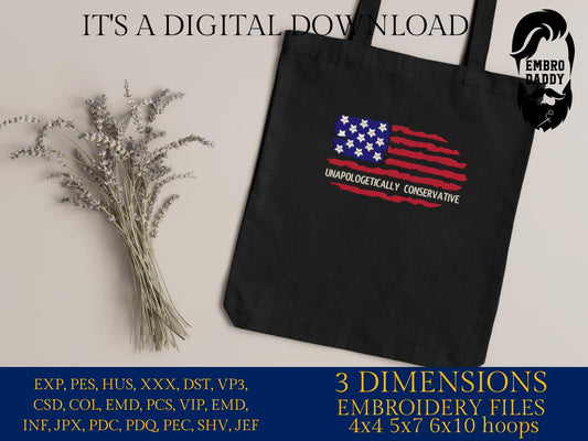 Machine Embroidery files, Unapologetic Conservative, Usa flag, PES, DST, hus & more
