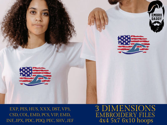 Machine Embroidery files, Swimming Usa flag, PES, DST, hus & more