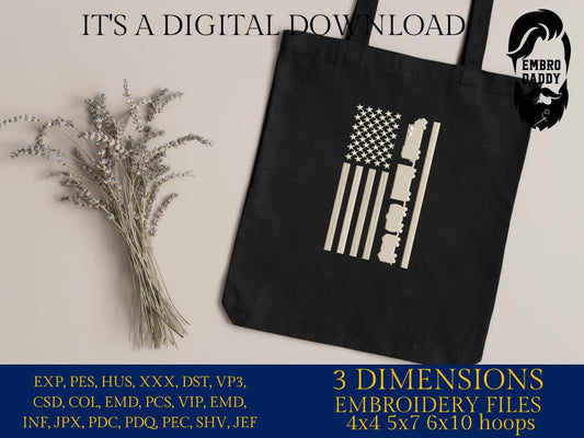 Machine Embroidery files, US flag Excavator, Heavy Equipment, Construction, PES, dst, xxx hus & more