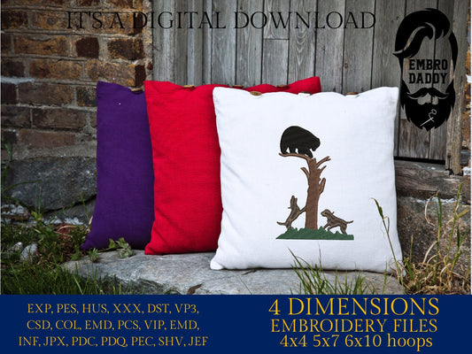 Machine Embroidery files, Hounds hunt a black bear, PES, xxx, dst, hus & more