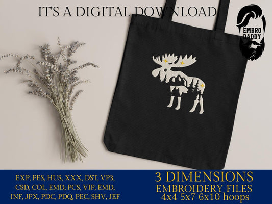 Machine Embroidery files, Moose mountains landscape, PES, dst, xxx, hus & more